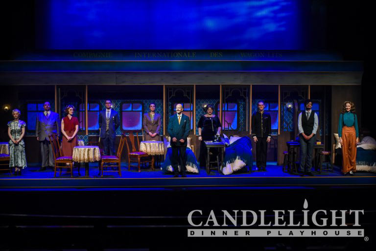 "The cars of Orient Express train fit nicely onto the stage with a great rendition of the train designed by Casey Kearns, with Master Carpentry by Dave MacEachen, and Scenic Painting by Joel Adam Chavez and Lelah Radostis. Lighting, costumes, and sound are excellent."